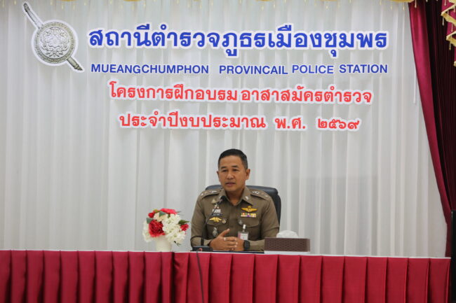 พ.ต.อ.ปัญญา ท้วมศรี ผู้กำกับการสถานีตำรวจภูธรเมืองชุมพร เป็นประธานเปิดโครงการ “ฝึกอบรมอาสาสมัครตำรวจ” อย่างเป็นทางการ ท่ามกลางเจ้าหน้าที่ตำรวจและประชาชนเข้าร่วมอย่างพร้อมเพรียง
