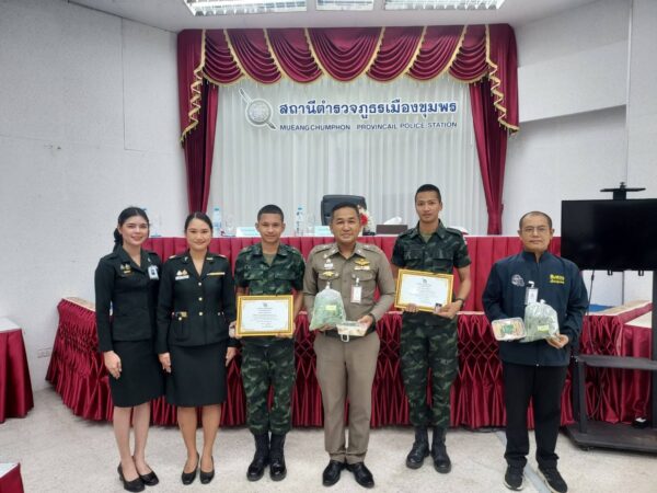 ผกก.สภ.เมืองชุมพร มอบใบประกาศเชิดชูเกียรติ 2 พลทหาร กล้าหาญช่วยภารกิจ