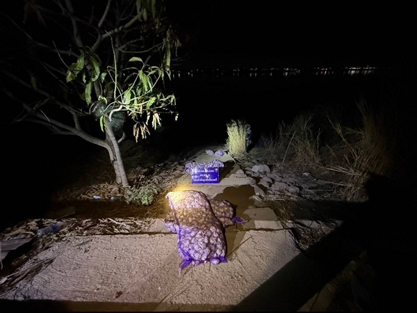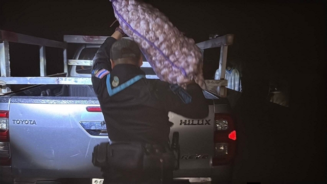 จากการตรวจสอบพื้นที่โดยรอบ พบของกลางเป็นกระเทียมบรรจุในกระสอบตาข่าย จำนวน 8 กระสอบ น้ำหนักเฉลี่ยกระสอบละ 20 กิโลกรัม รวมน้ำหนักประมาณ 160 กิโลกรัม ถูกทิ้งกระจัดกระจายบริเวณริมตลิ่ง