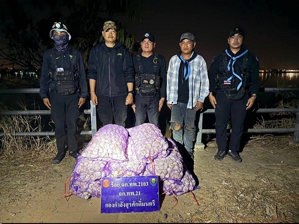 มุกดาหาร -ทพ 2103 ซุ่มจับกลางดึก! แก๊งลอบขนของเถื่อนข้ามโขงกลางเมืองมุกดาหารแตกฮือ ทิ้งกระเทียม 160 กก. เผ่นหนีทัน