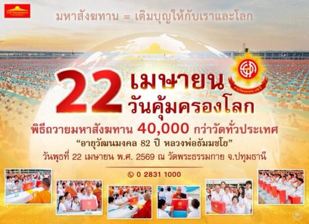 วันที่ 18 เมษายน 2569 พระครูสมุห์สนิทวงศ์ วุฑฺฒิวํโส, ดร. ผู้ช่วยเจ้าอาวาสวัดพระธรรมกาย จ.ปทุมธานี และผู้อำนวยการสำนักสื่อสารองค์กร เปิดเผยว่า วัดพระธรรมกายได้เตรียมความพร้อมจัดงานบุญใหญ่ พิธีถวายมหาสังฆทาน 40,000 กว่าวัดทั่วไทย เนื่องในวันคุ้มครองโลก และวาระอายุวัฒนมงคล 82 ปี หลวงพ่อธัมมชโย ในวันพุธที่ 22 เมษายน 2569 ณ ลานธรรม พระมหาธรรมกายเจดีย์ จ.ปทุมธานี พร้อมเปิดมาตรการอำนวยความสะดวกด้านการจราจร เพื่อลดผลกระทบบนถนนสายหลัก