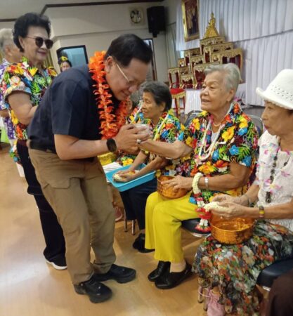 โดยหลังจากนั้นได้มีการรดน้ำขอพรผู้สูงอายุซึ่งเฉลี่ย 70 ปีขึ้นไปจำนวน 9 ท่าน โดย ว่าที่.ร.ต.ธนิตศักดิ์ ดารามั่น กล่าวว่า ความสำคัญของผู้สูงอายุก็คือผู้ที่ผ่านประสบการณ์ชีวิตในหน้าที่การงานโดยตนถือว่าเป็น “คลังสมอง” ให้กับคนรุ่นหลังเพื่อปรับปรุงประยุกต์ให้เข้ากับสถานการณ์โลกปัจจุบันในยุค AI โดยมุ่งหวังว่ารัฐบาล ต้องใช้งบประมาณจำนวนมากในการดูแลผู้สูงอายุไม่ว่าจะเป็นเบี้ยยังชีพผู้สูงอายุ บัตรสปสช. สำหรับผู้สูงอายุที่ไม่ได้รับราชการหรือเป็นพนักงานของรัฐ การให้บริการต่างๆกับผู้สูงอายุเป็นสิ่งจำเป็น ขอให้ปีใหม่ไทยปีนี้ให้ทุกท่านมีสุขภาพร่างกายที่แข็งแรงและต้องขอขอบคุณที่ให้ความ รักและสนับสนุนตนเองด้วยดีตลอดมา