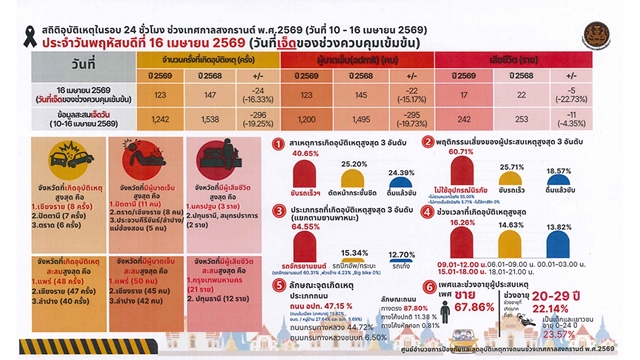 นพ.ธนะพงศ์ จินวงษ์ ผู้จัดการศูนย์วิชาการเพื่อความปลอดภัยทางถนน (ศวปถ.) กล่าวว่าข้อมูลสถานการณ์อุบัติเหตุช่วงสงกรานต์โดย ศูนย์อำนวยการป้องกันและลดอุบัติเหตุทางถนนช่วงเทศกาลสงกรานต์ ปี 2569 เทียบกับปี 2568 ว่า แม้ราคาน้ำมันแพงแต่การเดินทางเพิ่มขึ้น 0.8% ขณะที่อุบัติเหตุรวม 1,242 ครั้ง ลดลง 19.25% ผู้บาดเจ็บ 1,200 คน ลดลง 19.75% และเสียชีวิต 242 ราย ลดลง 4.35% อย่างไรก็ตาม ดัชนีความรุนแรงเพิ่มขึ้น โดยจากอุบัติเหตุ 100 ครั้ง มีผู้เสียชีวิตเพิ่มจาก 16 คน เป็น 19.48 คน โดยจังหวัดที่เกิดอุบัติเหตุสะสมสูงสุดคือ จ.แพร่ 48 ครั้ง และมีผู้บาดเจ็บสะสมสูงสุด 50 คน ขณะที่กรุงเทพมหานครมีผู้เสียชีวิตสะสมมากที่สุด 21 ราย รองลงมาคือ จ.ปทุมธานี 12 ราย สาเหตุหลักของอุบัติเหตุ ได้แก่ ขับรถเร็ว 40.65% ตัดหน้ากระชั้นชิด 25.20% และดื่มแล้วขับ 24.39% พฤติกรรมเสี่ยงสูงสุด ได้แก่ ไม่ใช้อุปกรณ์นิรภัย โดย 55.00% ไม่สวมหมวกนิรภัย รองลงมาคือขับรถเร็ว 25.71% และดื่มแล้วขับ 18.57% ประเภทรถที่เกิดเหตุสูงสุดคือรถจักรยานยนต์ 64.55% รองลงมารถกระบะ 15.34% จุดเกิดเหตุ 47.15% เป็นถนนขององค์กรปกครองส่วนท้องถิ่น และ 44.72% เป็นถนนกรมทางหลวง โดย 87.80% เกิดบนถนนทางตรง