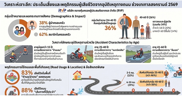 “ก่อนเทศกาลสงกรานต์ 2 วัน มีผู้เสียชีวิตจากอุบัติเหตุทางถนนถึง 102 ราย เมื่อเจาะลึกด้านเพศและวัย พบว่า 67.86% เป็นเพศชาย กลุ่มอายุที่เกิดอุบัติเหตุสูงสุดคือเด็กและเยาวชน 0–24 ปี (23.57%) รองลงมาคือวัยทำงาน 20–29 ปี (22.14%) ข้อมูลจากบริษัทกลางคุ้มครองผู้ประสบภัยจากรถ จำกัด ระบุว่า 38% ของผู้เสียชีวิตเป็นหัวหน้าครอบครัว และอีก 62% เป็นสมาชิกในครอบครัว นอกจากนี้ ยังพบว่า 83% เสียชีวิตในพื้นที่ตำบลหรืออำเภอของตนเอง และ 88% เสียชีวิตบนเส้นทางประจำ โดย 32% เสียชีวิตในระยะ 2–5 กิโลเมตรจากบ้าน และ 29% ในระยะ 6–10 กิโลเมตร สอดคล้องกับข้อค้นพบว่า ‘ใกล้บ้านไม่สวมหมวกนิรภัย ไม่มีใบขับขี่’ เป็นสาเหตุสำคัญของการเสียชีวิต โดยเฉพาะในกลุ่มเด็กและเยาวชน เสนอให้สื่อมวลชนสร้างมิติใหม่ของการสื่อสารเพื่อปรับเปลี่ยนพฤติกรรม โดยเปิดโอกาสให้ประชาชนมีส่วนร่วมในการเล่าประสบการณ์จริงหรือความผิดพลาดที่เกิดขึ้น พร้อมแสวงหาแนวร่วมใหม่ ๆ ในการจัดการความเสี่ยงด้านความปลอดภัยทางถนน”นพ.ธนะพงศ์ กล่าว