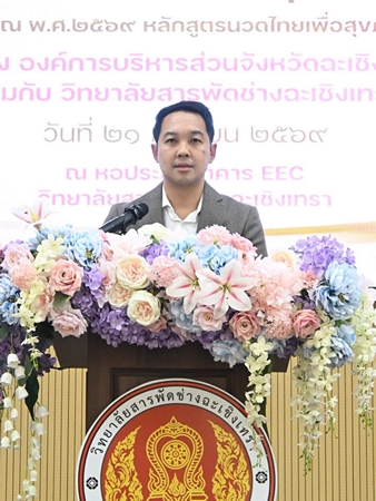🗓️วันที่ 21 เมษายน 2569 เวลา 14.00 น. #นายกลยุทธ ฉายแสง #นายกองค์การบริหารส่วนจังหวัดฉะเชิงเทรา มอบหมายให้ #ดร.รัฐสภา นพเกตุ #รองนายกองค์การบริหารส่วนจังหวัดฉะเชิงเทรา เป็นประธานในพิธีเปิดโครงการส่งเสริมสุขภาพด้วยศาสตร์การแพทย์แผนไทย การนวดเพื่อสุขภาพ ประจำปีงบประมาณ พ.ศ. 2569 หลักสูตรนวดไทยเพื่อสุขภาพ 150 ชั่วโมง โดยมีนายเจษฎา แพงแสงไพศาล ปลัดองค์การบริหารส่วนจังหวัดฉะเชิงเทรากล่าวรายงานวัตถุประสงค์การดำเนินงาน พร้อมด้วยคณะผู้บริหารและคณะอาจารย์วิทยาลัยสารพัดช่างฉะเชิงเทรา หัวหน้าส่วนราชการ และผู้เข้ารับการอบรมร่วมพิธีเปิดโครงการ ณ วิทยาลัยสารพัดช่าง ตำบลบางตีนเป็ด อำเภอเมืองฉะเชิงเทรา จังหวัดฉะเชิงเทรา