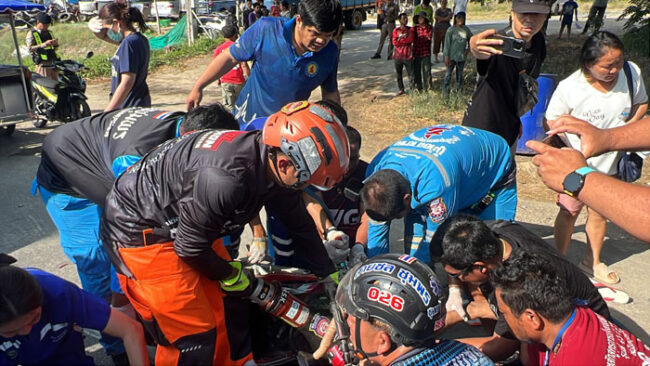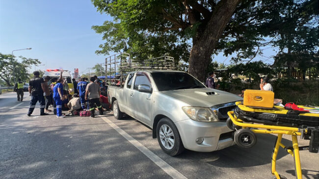 ชุมพรระทึก! ชนสนั่นท้ายกระบะ เหล็กโช้กแทงต้นขาคนขี่ จนท.ต้องใช้เครื่องตัดช่วยชีวิต