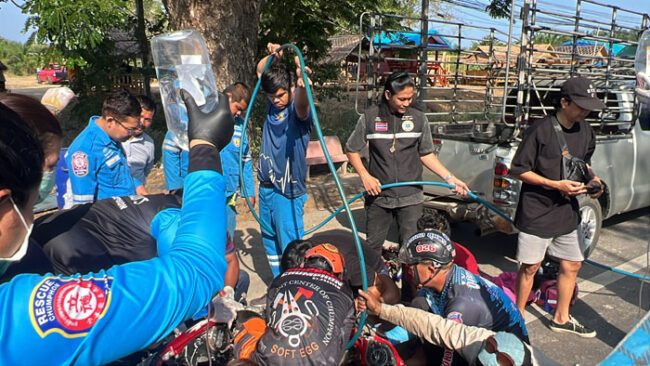 ในที่เกิดเหตุพบผู้บาดเจ็บ 2 ราย เป็นชายวัยประมาณ 20 ปี โดย 1 รายหมดสติ ถูกเร่งนำส่งโรงพยาบาล ส่วนผู้ขับขี่รถจักรยานยนต์ฮอนด้าสีแดง ไม่ติดแผ่นป้ายทะเบียน ได้รับบาดเจ็บที่ใบหน้าและปาก และที่สำคัญพบว่า “โช้กล้อหน้า” แทงลึกเข้าไปในต้นขาด้านซ้าย ไม่สามารถนำออกได้ทันที เจ้าหน้าที่กู้ชีพต้องใช้เครื่องตัดถ่าง ตัดชิ้นส่วนรถออกจากร่างอย่างระมัดระวัง ก่อนนำส่งโรงพยาบาลอย่างเร่งด่วน