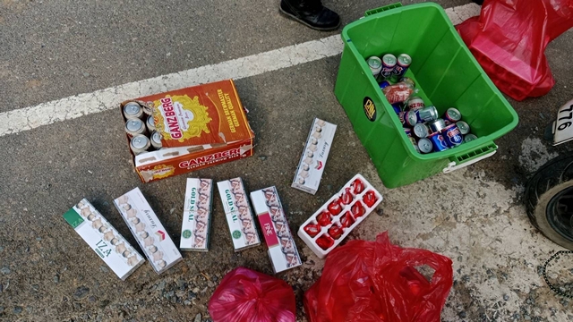 รายที่ 2 นางทิม (นามสมมุติ)อายุ 40 ปี พร้อมของกลาง ได้แก่ บุหรี่ LUXURY จำนวน 2 แท่ง, บุหรี่ GOLD SEAL จำนวน 3 แท่ง, บุหรี่ FINE จำนวน 1 แท่ง, บุหรี่ IZA จำนวน 1 แท่ง, สุราแช่ (เบียร์) จำนวน 2 แพ็ค, เครื่องดื่ม BOOSTRONG จำนวน 18 กระป๋อง และเครื่องดื่ม DAZZ จำนวน 24 กระป๋อง